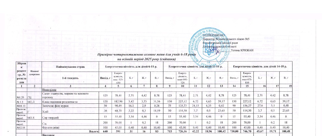 У ліцеї № 5 меню на понеділок у перший тиждень було таким: