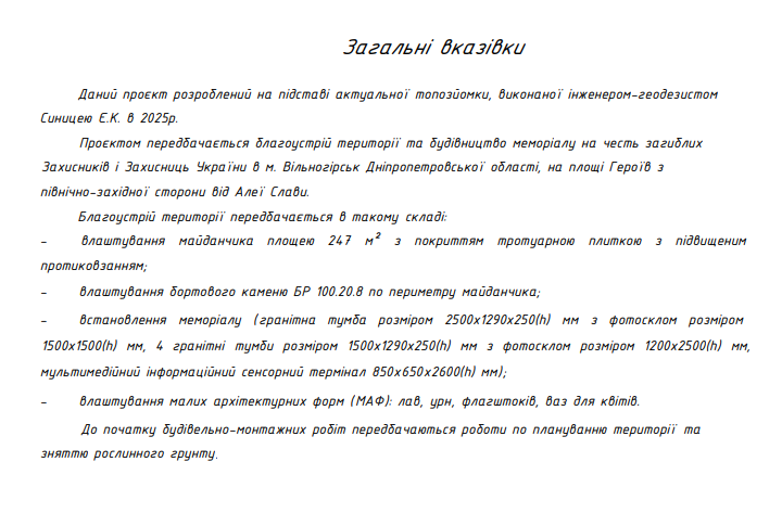 Згідно з проєктною документацією та умовами договору, будівництво меморіалу “Живі, поки пам’ятаємо” включає не лише сам монумент, а й повний благоустрій прилеглої території, на якій встановлять лави, урни, флагшток, вази для квітів.