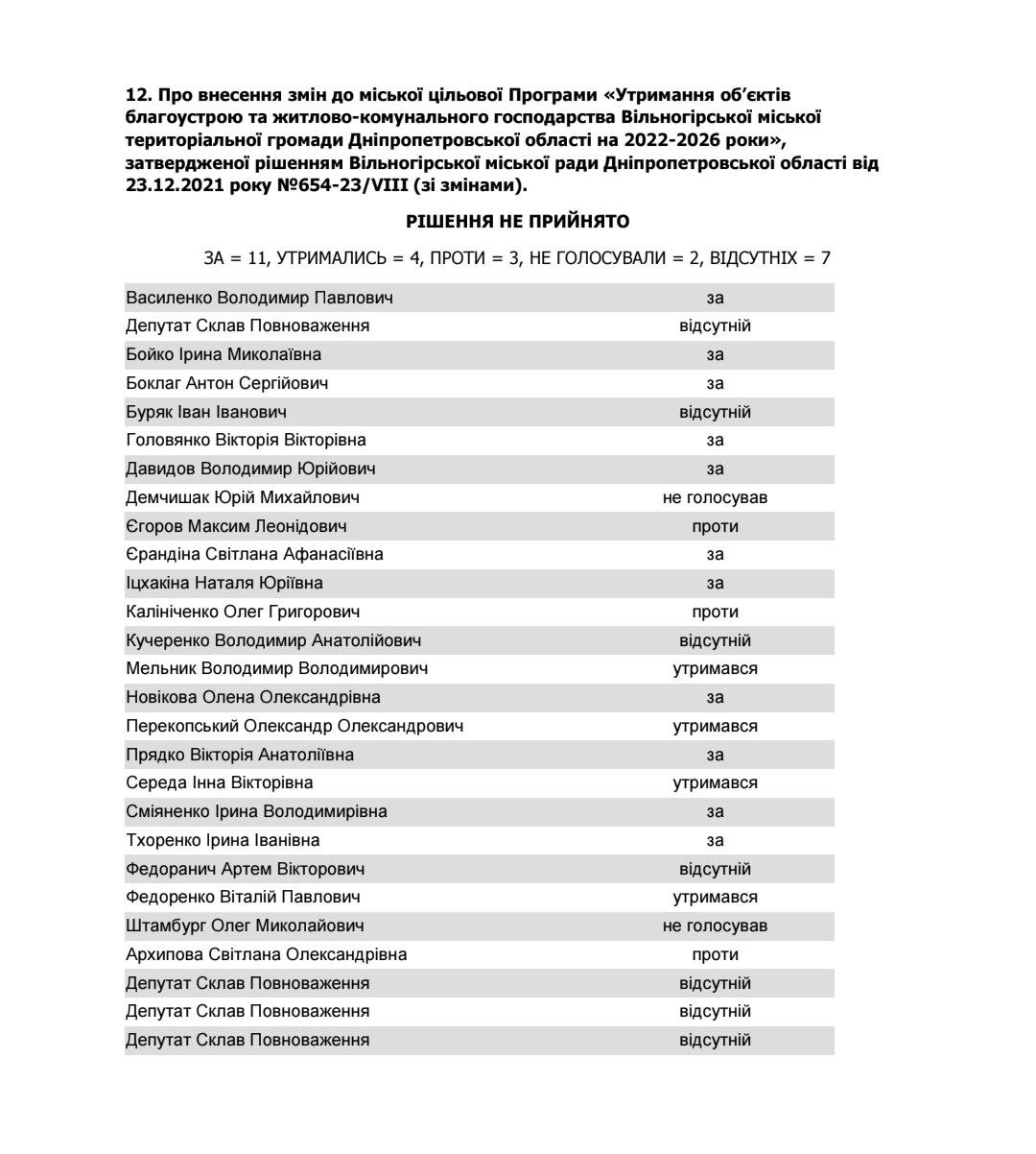 Під час голосування депутати не підтримали рішення. “За” проголосувало 11 депутатів, ще троє — проти. Утриматися від голосування вирішили 4 депутати. Ще 7 — були відсутніми.