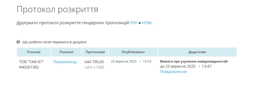 Переможець тендеру / скріншот Prozorro
