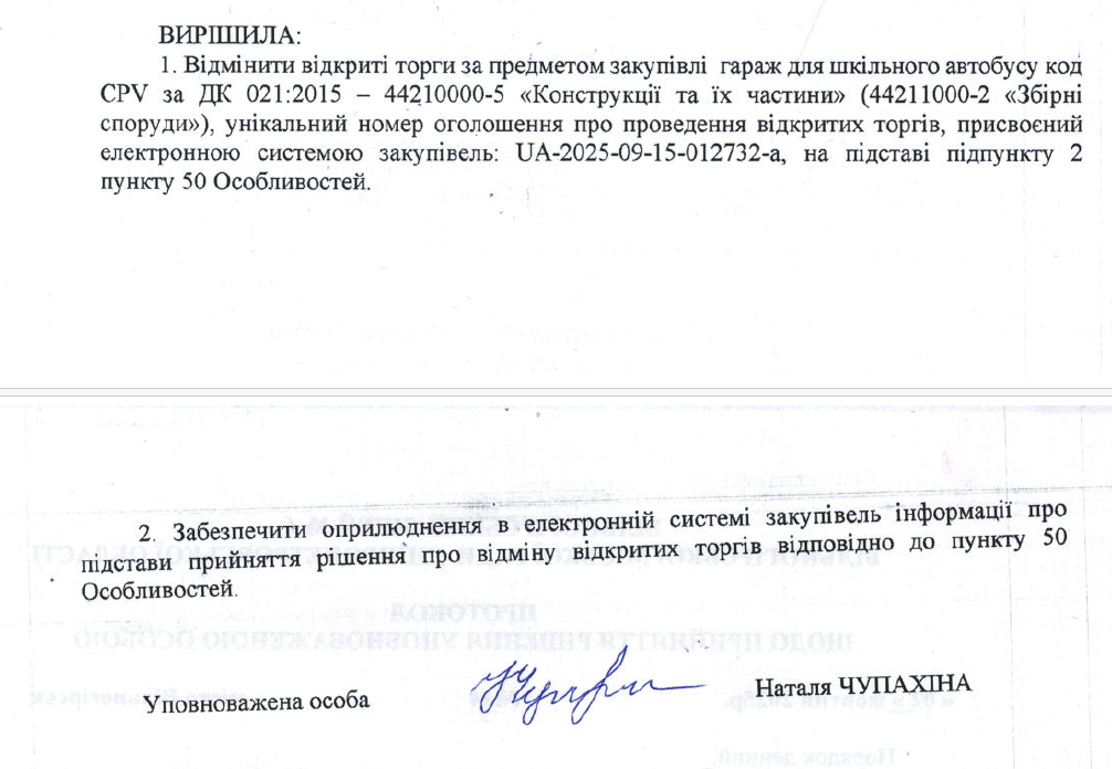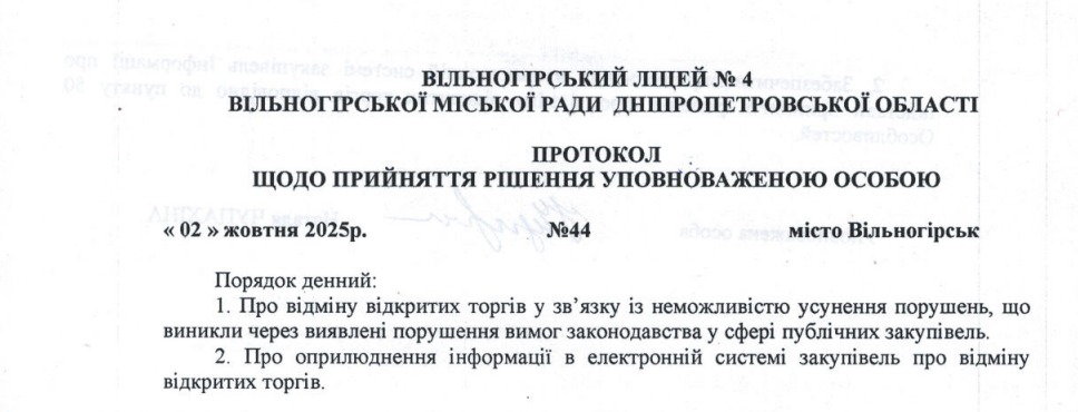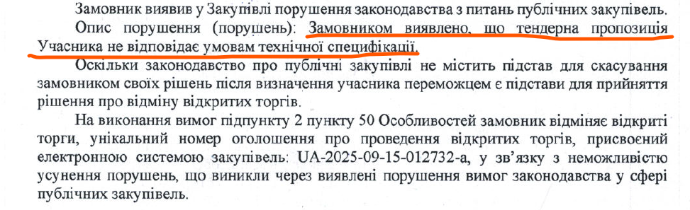 Проте 2 жовтня 2025 року ліцей №4, як замовник, відмінив відкриті торги через неможливість усунення порушень у процедурі закупівлі.Відповідно до протоколу уповноваженої особи, тендерна пропозиція учасника не відповідала умовам технічної специфікації. Через це замовник скористався нормами постанови КМУ №1178 і скасував закупівлю.